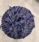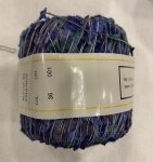 Paradise by Plymouth Yarn. Weight is Fingering/Ladder Ribbon, carrying yarn. Color 36 - Ocean - Multi-colored blend including various shades of blue, lavender, and dark sea green. 80% Rayon, 20% Nylon. 164 yds, 50 gram skein.