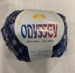 Odyssey by Plymouth Yarn. Weight is Bulky/Ribbon component. Color 04 - Blue(s). 60% Nylon, 40% Wool. 72 yds, 50 gram skein. Gauge: 12.0 sts = 4 inches Needle US 10½ - 6.5 mm